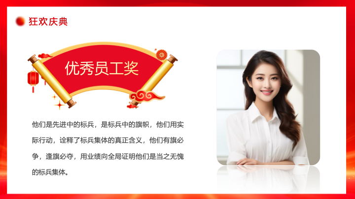 • 颁奖页面建议:可设计多种优秀员工的展示和颁奖页面,包括个人奖、团队奖等,方便您展示获奖者的风采和成就,增强盛典的荣誉感。