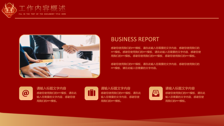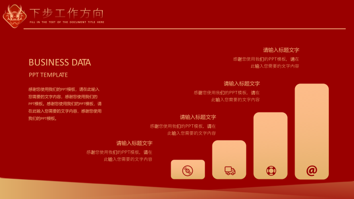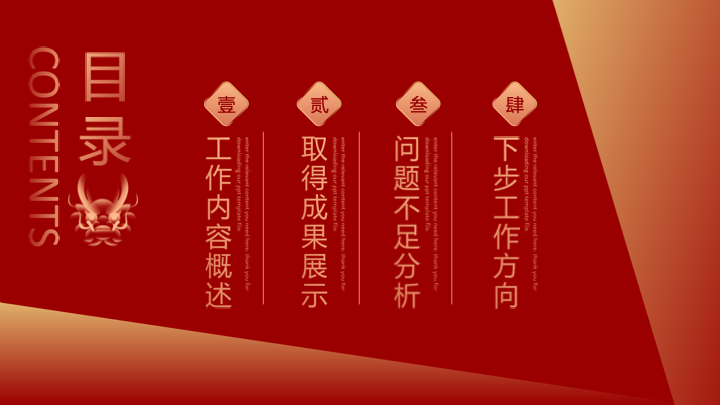 - 数据可视化图表:包含多种与整体红金风格统一的数据图表,如柱状图、饼图和百分比展示图,能够专业、直观地呈现年度业绩与数据分析结果。