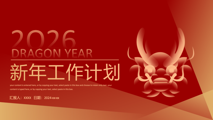 这是一款充满力量感与节日氛围的红金商务大气新年工作计划PPT模板。模板以经典的红色与金色为主色调,采用富有立体质感的金属字体和光效元素,营造出一种隆重、正式且充满希望的视觉效果。它完美契合“新年伊始,万象更新”的主题 ,是企业年会、年度总结和开年启动大会的绝佳选择,助力您的团队展现新一年的宏伟蓝图。