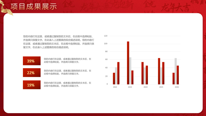 • 数据可视化图表:包含多种与整体红金风格统一的数据图表,如柱状图、饼图和百分比展示图,能够专业、直观地呈现年度业绩与数据分析结果。