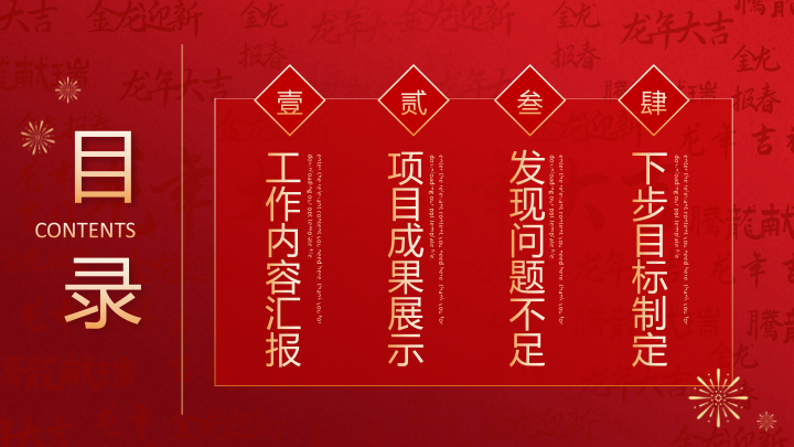 • 封面与目录页:封面以“新年伊始 万象更新”为主题 ,采用立体切割效果的“2024”金色数字,视觉冲击力强。目录页延续封面风格,清晰导航“工作内容汇报”、“取得成果展示”、“发现问题不足” 和“下步工作方向” 四大核心模块。