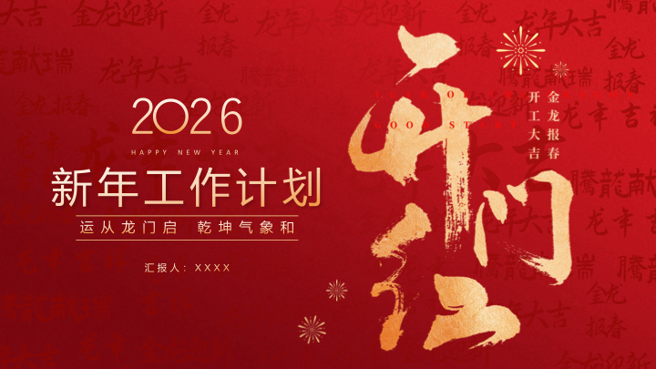 这是一款充满力量感与节日氛围的红金商务大气新年工作计划PPT模板。模板以经典的红色与金色为主色调,采用富有立体质感的金属字体和光效元素,营造出一种隆重、正式且充满希望的视觉效果。它完美契合“新年伊始,万象更新”的主题 ,是企业年会、年度总结和开年启动大会的绝佳选择,助力您的团队展现新一年的宏伟蓝图。