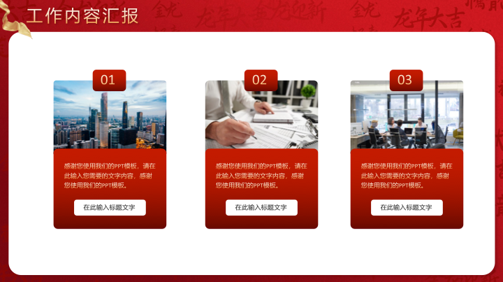红金商务大气新年工作计划PPT模板 红金商务大气新年工作计划PPT模板 红金商务大气新年工作计划PPT模板 红金商务大气新年工作计划PPT模板以下为您展示模板的部分精选页面,包括大气恢弘的封面、3D立体风格的目录页、专业的图文版式及数据图表页,助您快速领略模板的庄重与专业。