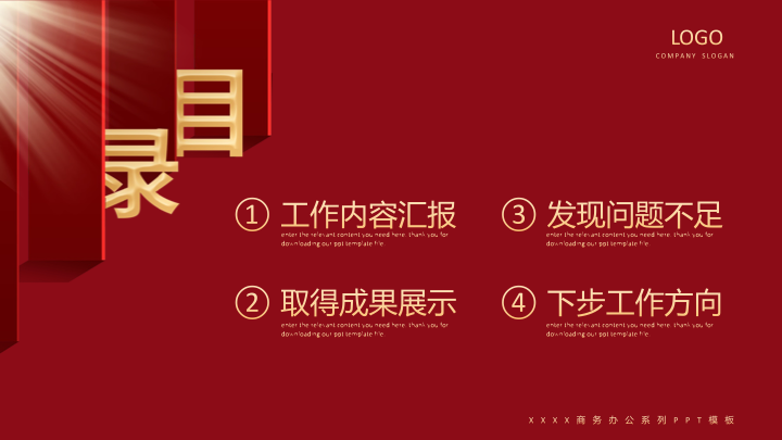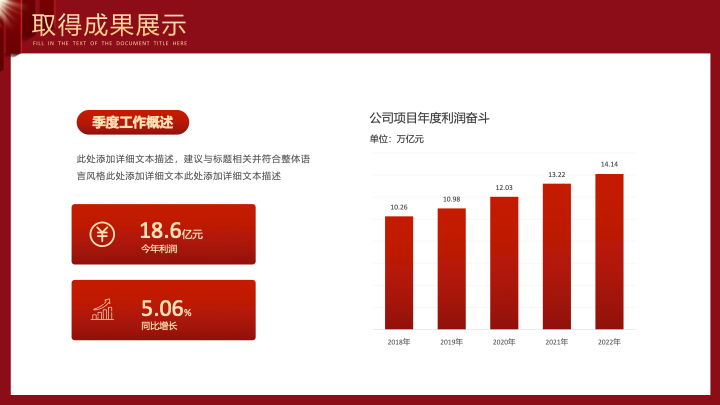 - 数据可视化图表:包含多种与整体红金风格统一的数据图表,如柱状图、饼图和百分比展示图,能够专业、直观地呈现年度业绩与数据分析结果。
