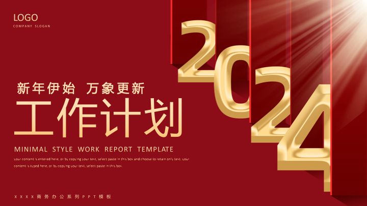 这是一款充满力量感与节日氛围的红金商务大气新年工作计划PPT模板。模板以经典的红色与金色为主色调,采用富有立体质感的金属字体和光效元素,营造出一种隆重、正式且充满希望的视觉效果。它完美契合“新年伊始,万象更新”的主题 ,是企业年会、年度总结和开年启动大会的绝佳选择,助力您的团队展现新一年的宏伟蓝图。