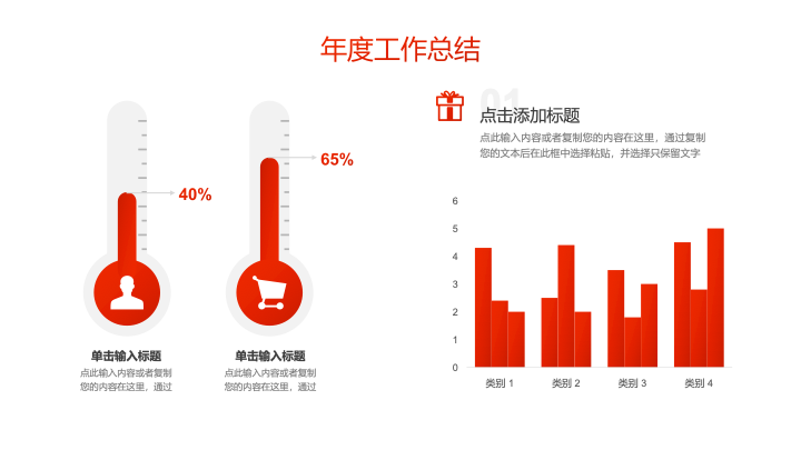 - 可视化图表:内含多种专为数据展示设计的图表页面,包括条形图、折线图等,均进行了与整体风格一致的红金配色设计,可以直观地呈现年度数据和业绩。