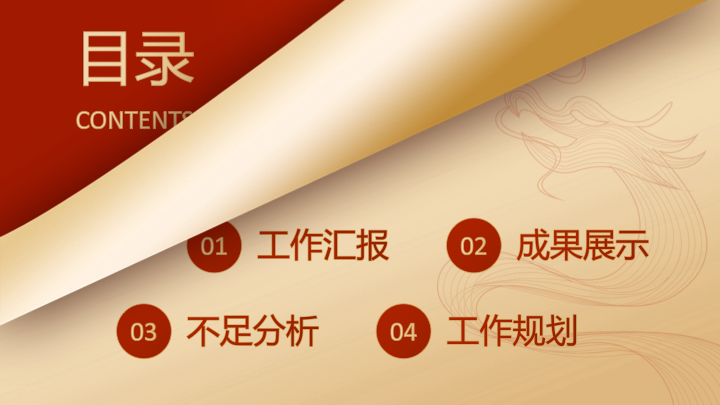 本模板是各类企业、单位进行年终工作总结、年度规划、部门述职、项目复盘的绝佳选择。其浓郁的中国风设计,也同样适用于公司年会、庆典活动等多种大型正式场合,能够营造出热烈、隆重的现场氛围。