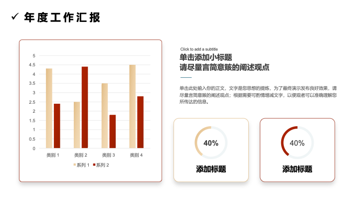 - 可视化图表:内含多种专为数据展示设计的图表页面,包括条形图、折线图等,均进行了与整体风格一致的红金配色设计,可以直观地呈现年度数据和业绩。