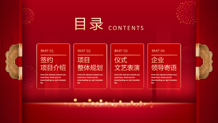 以下为模板内部核心页面的截图预览,您可以直观地感受到其大气磅礴的设计风格和完整的启动会内容框架。