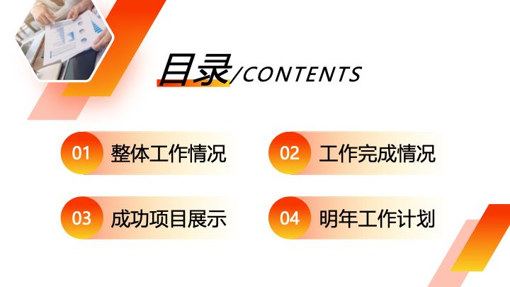 - 封面与目录页:封面设计直奔主题,清晰标明“行政部门新年工作计划”,专业且正式。目录页使用大数字序号进行视觉引导,将“整体工作情况”、“工作完成情况”、“成功项目展示”、“明年工作计划”四个核心模块清晰呈现。