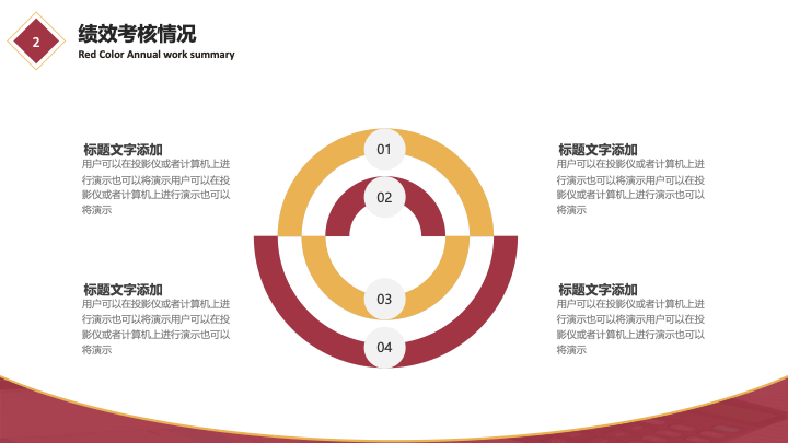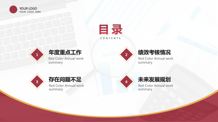 - 内容框架:模板内置了完整的工作汇报逻辑框架,包含“年终工作总结”、“工作成果展示”、“经验不足总结”和“明年工作计划”四个核心环节,帮助您全面梳理年度工作。
