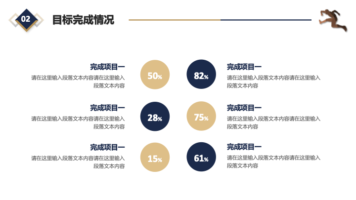 • 可视化图表:内含多种专为数据展示设计的图表页面,包括条形图、饼图等,可以直观地呈现年度数据和业绩。
