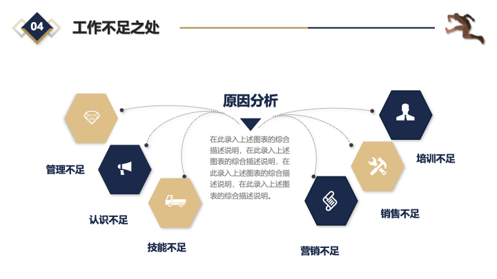 • 内容框架:模板内置了完整的工作汇报逻辑框架,包含“工作回顾”、“完成情况”、“不足之处”和“未来计划”四个核心环节,帮助您全面梳理年度工作。