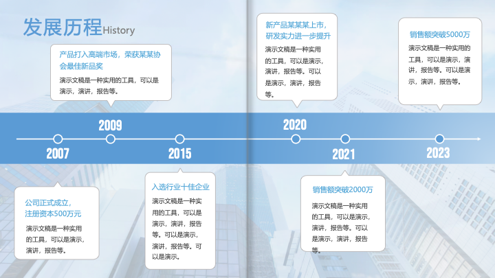 • 公司概况介绍:此章节包含企业简介、发展历程(时间轴)、公司理念及核心团队介绍等页面 ,用于全面展示公司的综合概况与软实力。