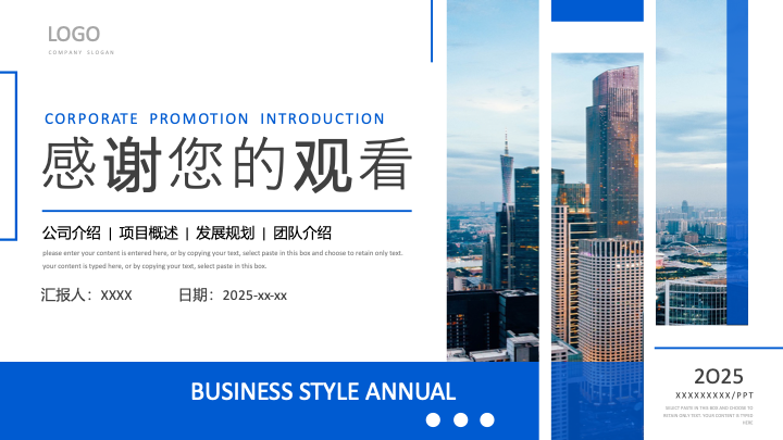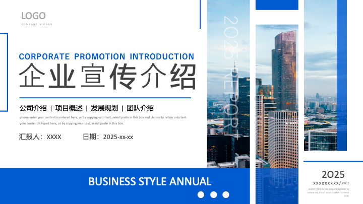 这是一款专业、规范的简约商务风公司宣传介绍PPT模板。模板采用简洁明了的版式设计与清晰的逻辑结构,通过专业的商务摄影图和结构化布局,旨在帮助企业进行全面、系统的自我展示。整体风格沉稳、大气,非常适合用于正式的商业汇报场合,如公司介绍、品牌宣传、项目推广或商业计划书等。
