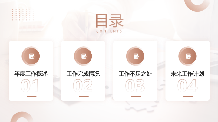 - 章节过渡页:每个章节都配有统一视觉风格的过渡页,采用大写的中文数字(壹、贰、叁、肆)作为章节标识,既有设计感又显得庄重正式。