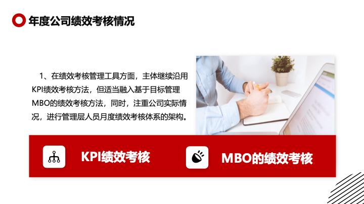 - 年度考核情况:详细阐述了本年度采用的绩效管理工具(如KPI与MBO结合)、考核内容的区分(固定与非固定项目)、以及评价维度的增加(如“总经理满意度”)等具体实践。