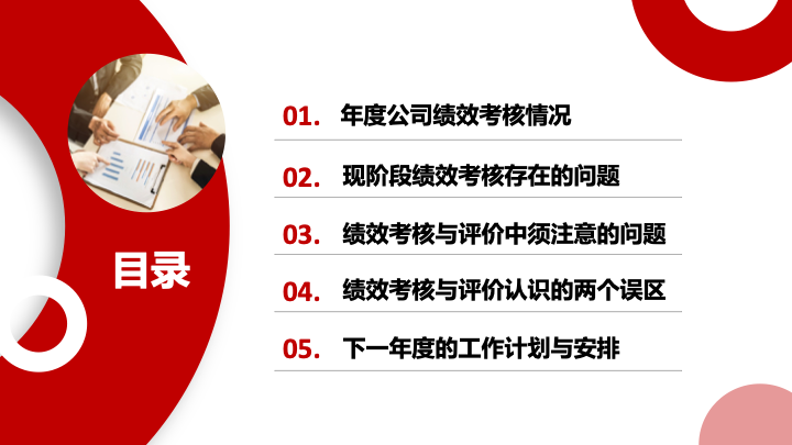 - 封面与目录页:封面以“人力资源年终考核”为主题,风格专业、沉稳。目录页逻辑严谨,完整呈现了“年度公司绩效考核情况”、“现阶段绩效考核存在的问题”、“绩效考核与评价中须注意的问题”、“绩效考核与评价认识的两个误区”、“下一年度的工作计划与安排”五个深度剖析模块。