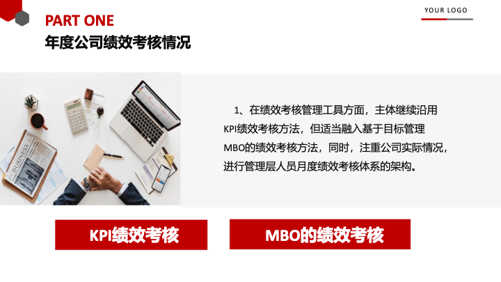 - 年度考核情况:详细阐述了本年度采用的绩效管理工具(如KPI与MBO结合)、考核内容的区分(固定与非固定项目)、以及评价维度的增加(如“总经理满意度”)等具体实践。