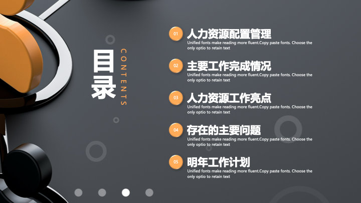 • 封面与目录页:封面设计简洁大气,以团队合作为主题的商务摄影图突出“人力资源部工作总结”的核心。目录页逻辑清晰,完整呈现了“人力资源配置管理”、“主要工作完成情况”、“人力资源工作亮点”、“存在的主要问题”、“明年工作计划”五个核心模块。