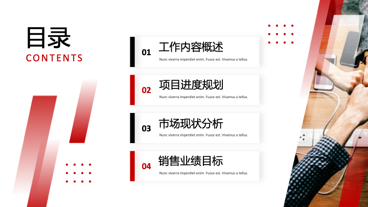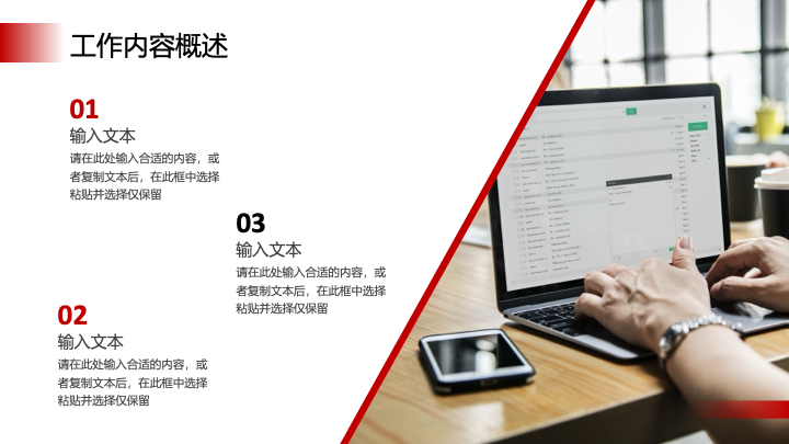 - 章节过渡页:每个章节都配有统一视觉风格的过渡页,通过大号数字序号和标题进行区分,保持了演示的逻辑性和流畅性。