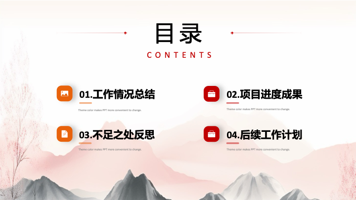 - 封面与目录页:以“简约新中式风工作总结计划”为主题 ,展开一幅水墨山水画卷 ,风格鲜明,目录页则清晰列出四大章节 ,引导观众快速把握汇报框架。