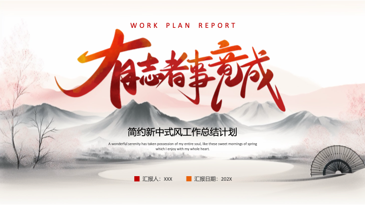 这是一款充满东方美学意境的简约新中式风工作总结计划PPT模板。模板以淡雅的水墨山水为背景,点缀以朱红和折扇元素,营造出一种沉静而专业的氛围。非常适合用于年终述职、新年规划等各类正式汇报场合,彰显汇报者的文化品味与稳重气质。