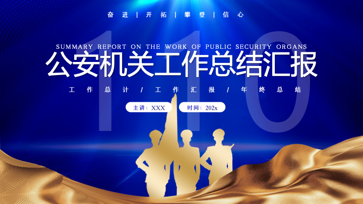 本模板是公安、检察、法院等政法机关及各级党政部门进行年终总结、工作汇报、党建学习、表彰大会的专用选择。其庄重、正式的设计风格,完美契合党政机关的汇报要求,能够营造出严肃、专业的会议氛围。