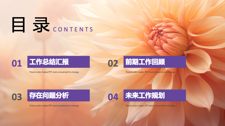 - 封面与目录页:封面以“只争朝夕 不负韶华”的书法艺术字点题,配以唯美的大丽花背景,温柔而有力量。目录页延续了花卉背景,清晰地导航“工作总结汇报”、“前期工作回顾”、“存在问题分析”、“未来工作规划”四大章节。