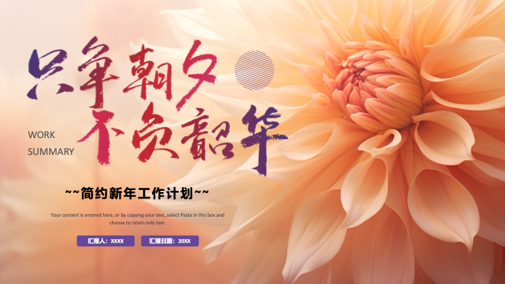 这是一款充满治愈感与柔美气息的唯美温馨风新年工作计划PPT模板。模板以绽放的大丽花特写摄影为背景,运用温暖柔和的光影效果,营造出一种宁静、雅致且充满生命力的氛围。搭配上“只争朝夕,不负韶华”的书法艺术字,为整份报告注入了温柔而坚定的力量,是女性用户或美学相关行业进行年度总结的绝佳选择。